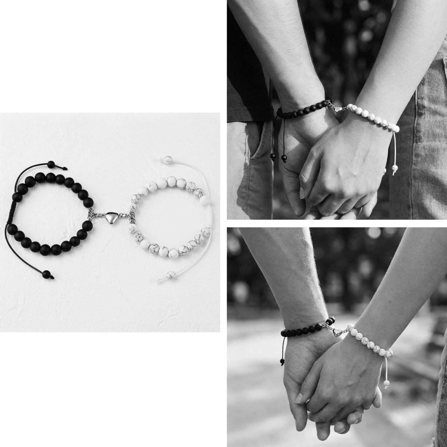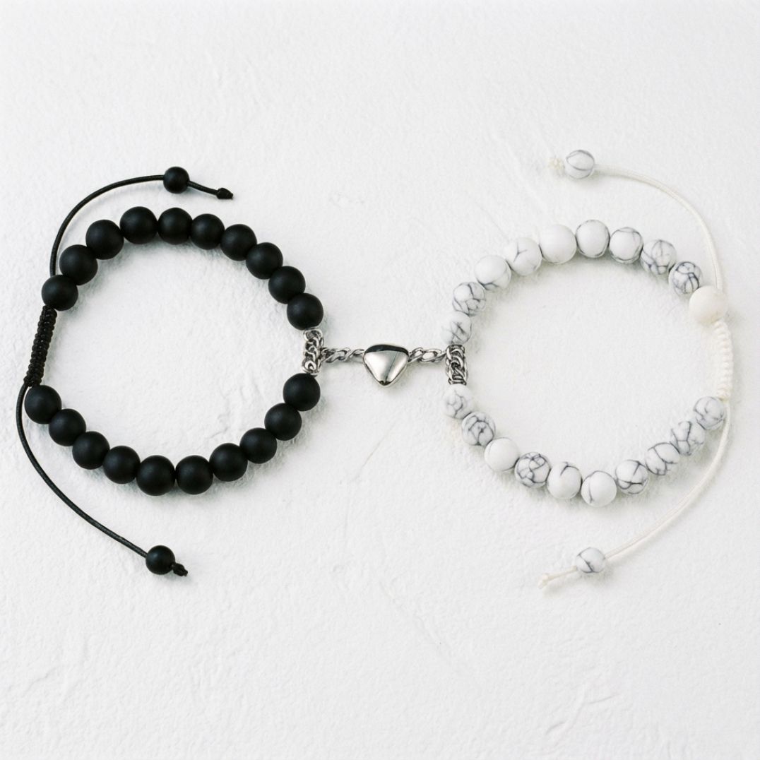 Das Set besteht aus zwei hochwertigen Armbändern: einem in tiefmattem Schwarz und einem in edlem Weiß mit Marmoreffekt. Verbunden werden beide durch ein minimalistisches Herz-Element aus poliertem Edelstahl – ein Symbol für eure unzertrennliche Verbindung.