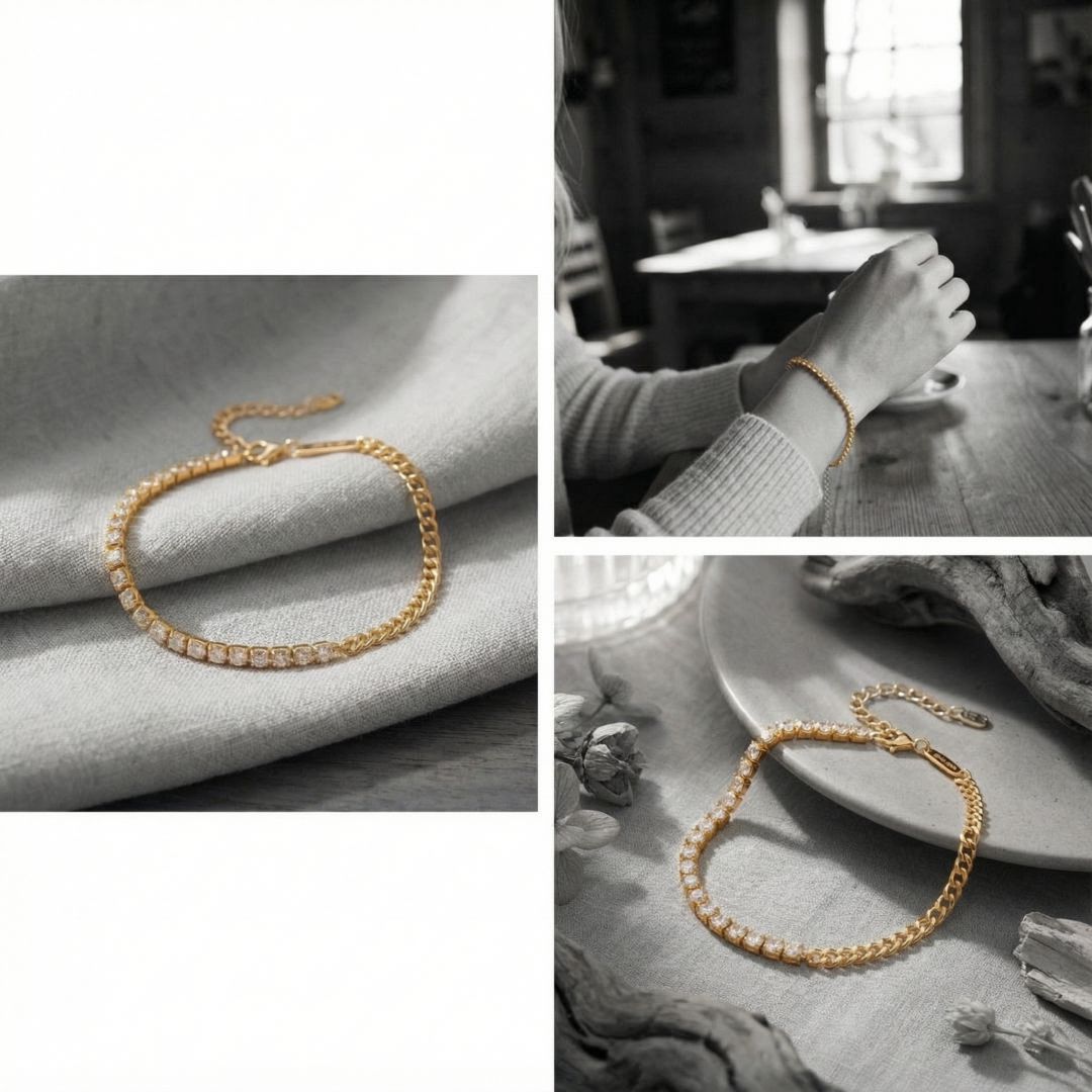 Das Zweifach Glanz Armband vereint zwei edle Stilwelten in einem Design: eine feine Gliederkette und eine funkelnde Steinreihe, perfekt aufeinander abgestimmt. Dieses Armband wurde für Frauen geschaffen, die schlichte Eleganz lieben und gleichzeitig einen Hauch von Luxus tragen möchten.