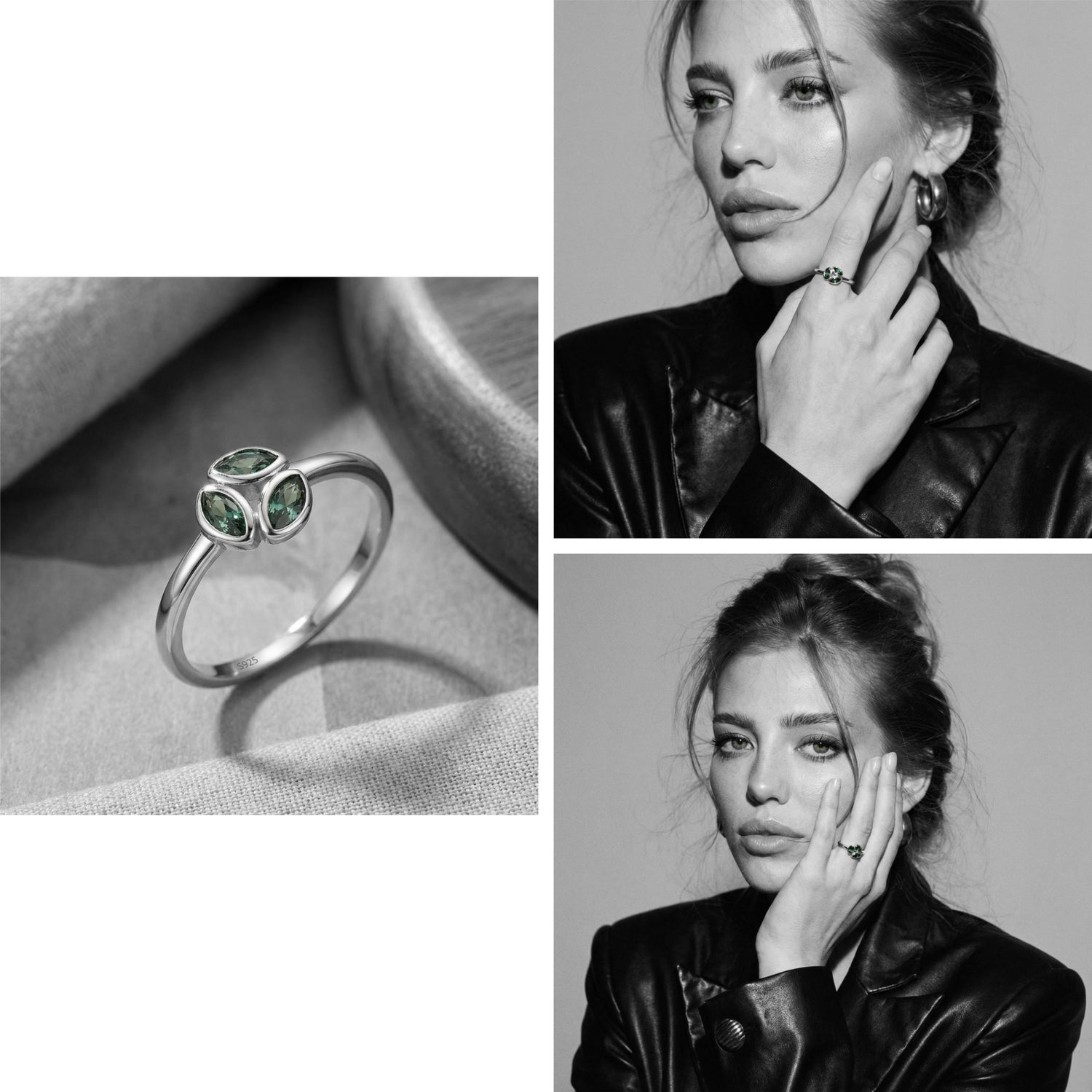 "Dieser filigrane 925er Silberring mit drei funkelnden grünen Kristallen verleiht jedem Look eine elegante, natürliche Note. Leicht, hautfreundlich und perfekt als tägliches Lieblingsstück oder besonderes Geschenk."
