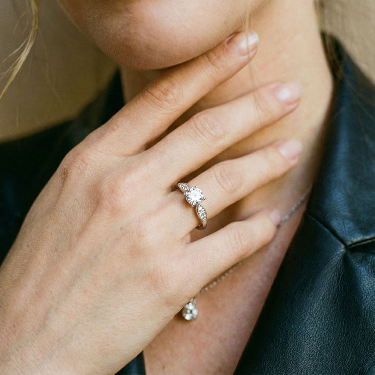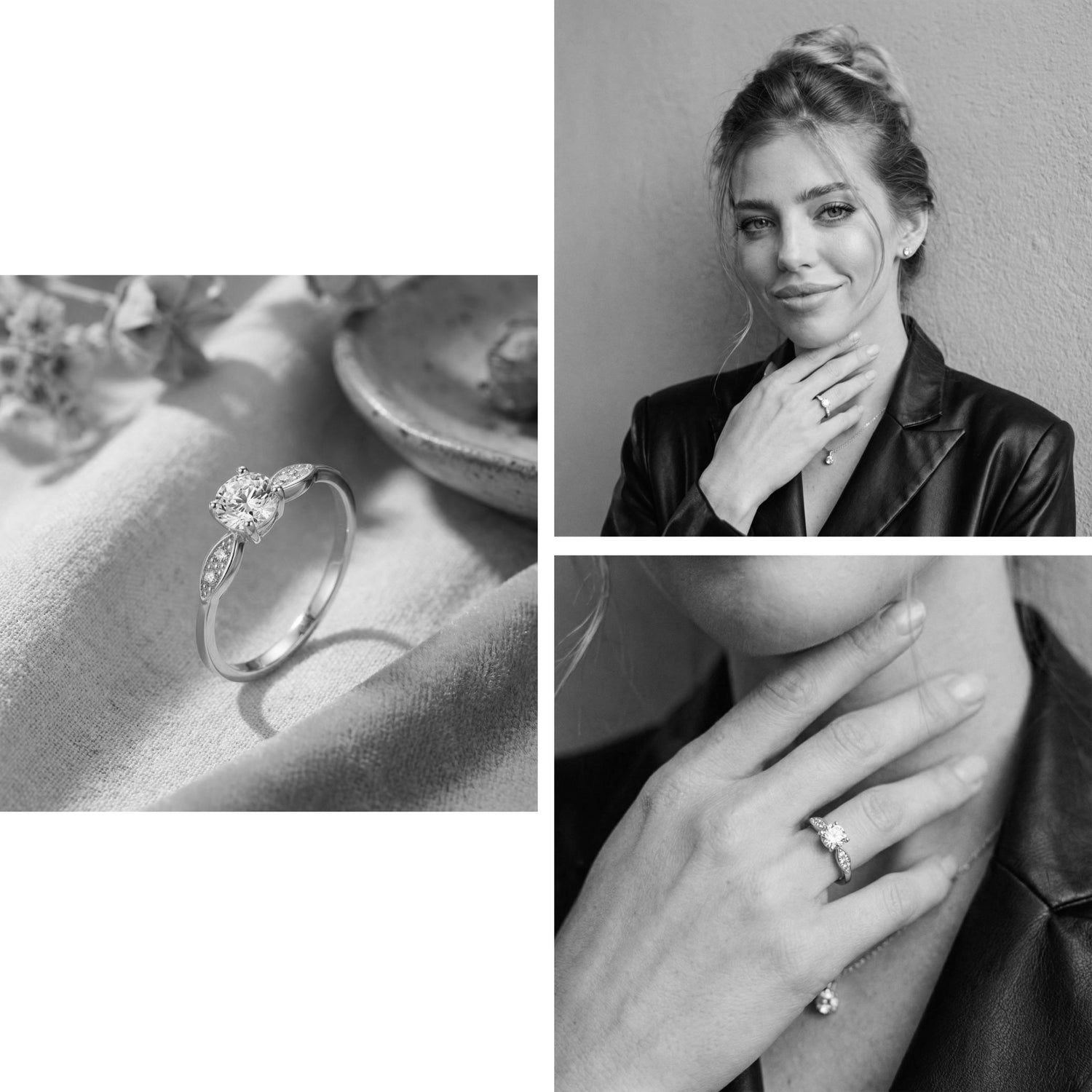 Der funkelnde Mittelstein wird von zwei filigranen Seitenakzenten umrahmt, die an sanfte Blütenblätter erinnern und dem Ring eine romantische Ausstrahlung verleihen.