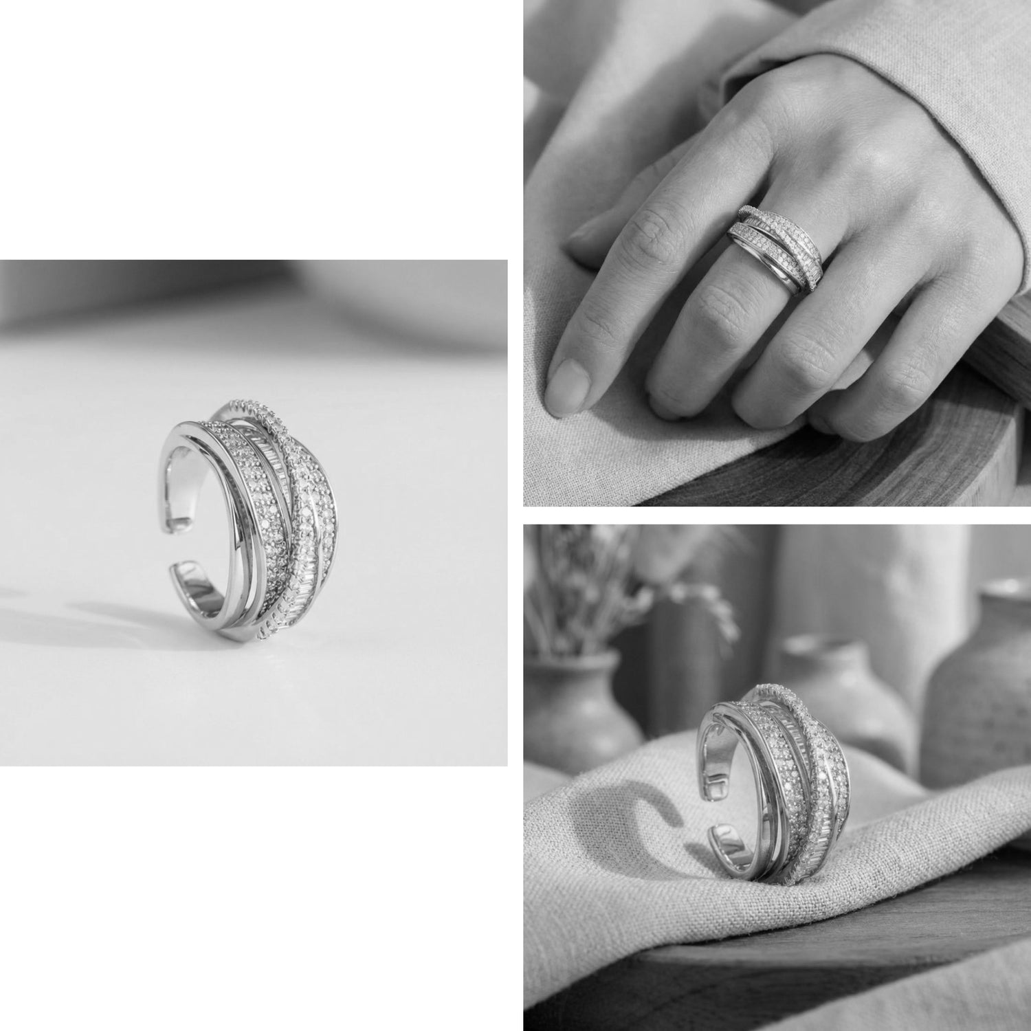 "Dieser moderne, offen gestaltete Ring mit funkelnden Kristallreihen setzt einen eleganten Akzent und passt zu jedem Look. Ein vielseitiges Schmuckstück – ideal für Alltag und besondere Momente."