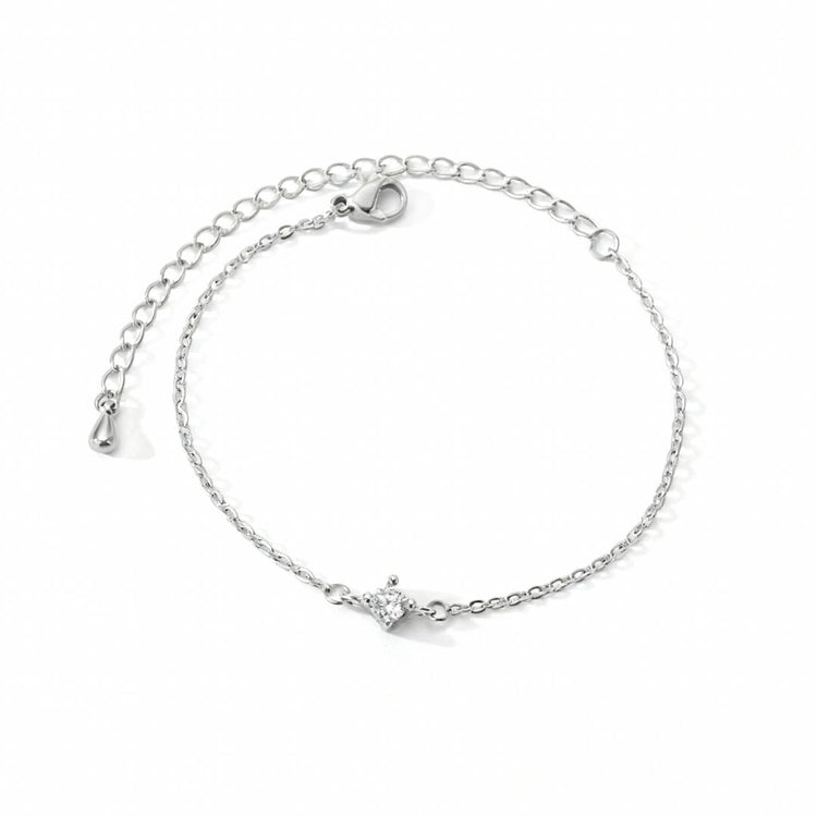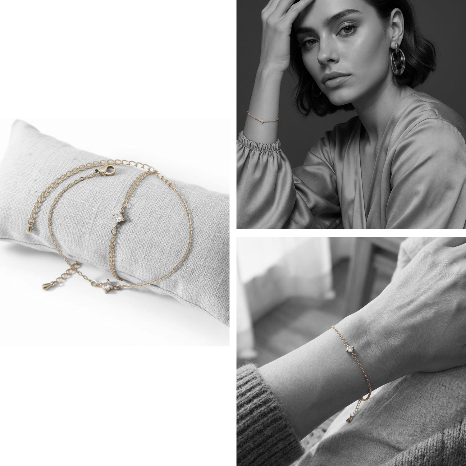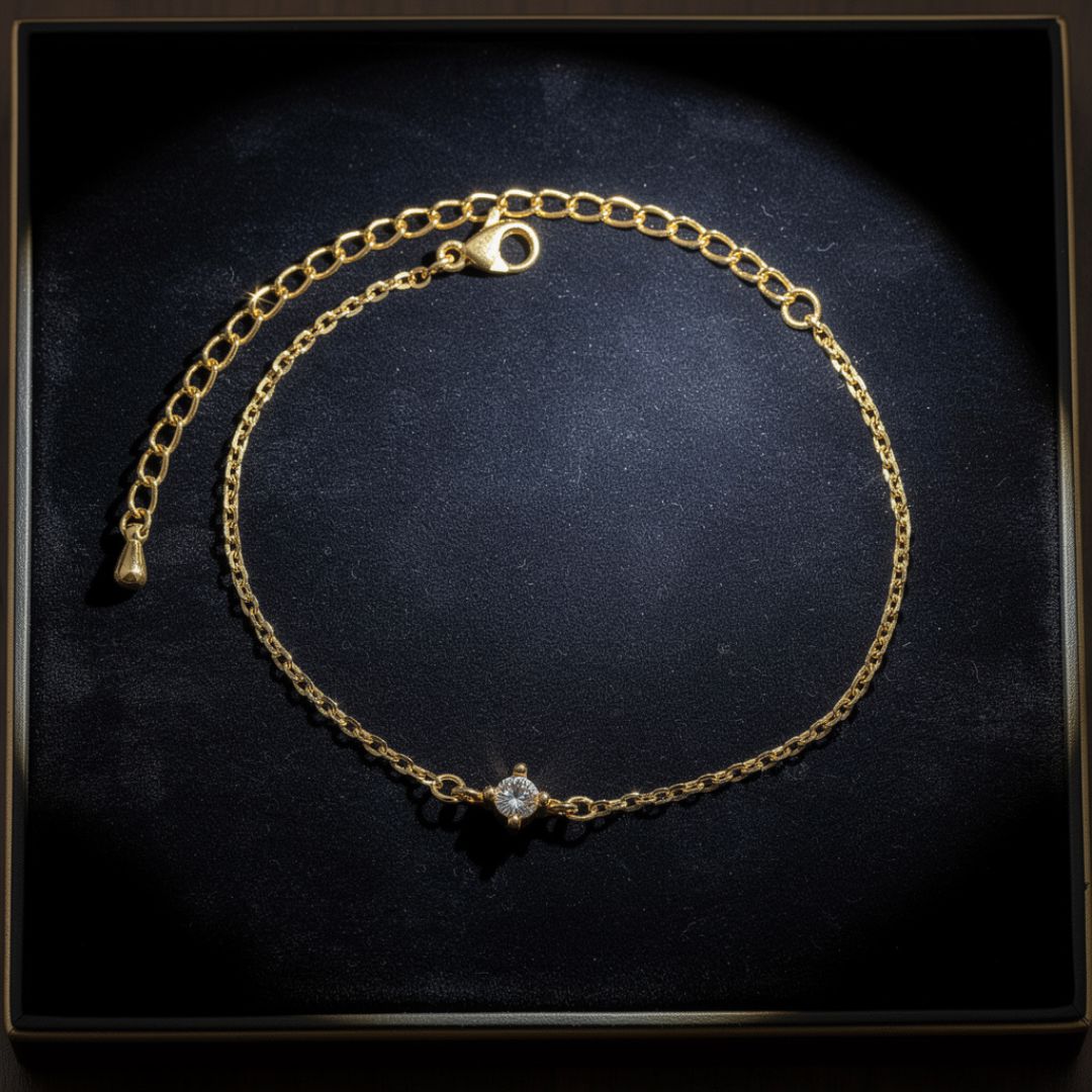 Das FeinGlanz Armband verbindet zarte Eleganz mit zeitlosem Minimalismus. Die feine, goldene Kette schmiegt sich leicht an das Handgelenk an, während der funkelnde Stein in der Mitte bei jeder Bewegung sanft das Licht einfängt.