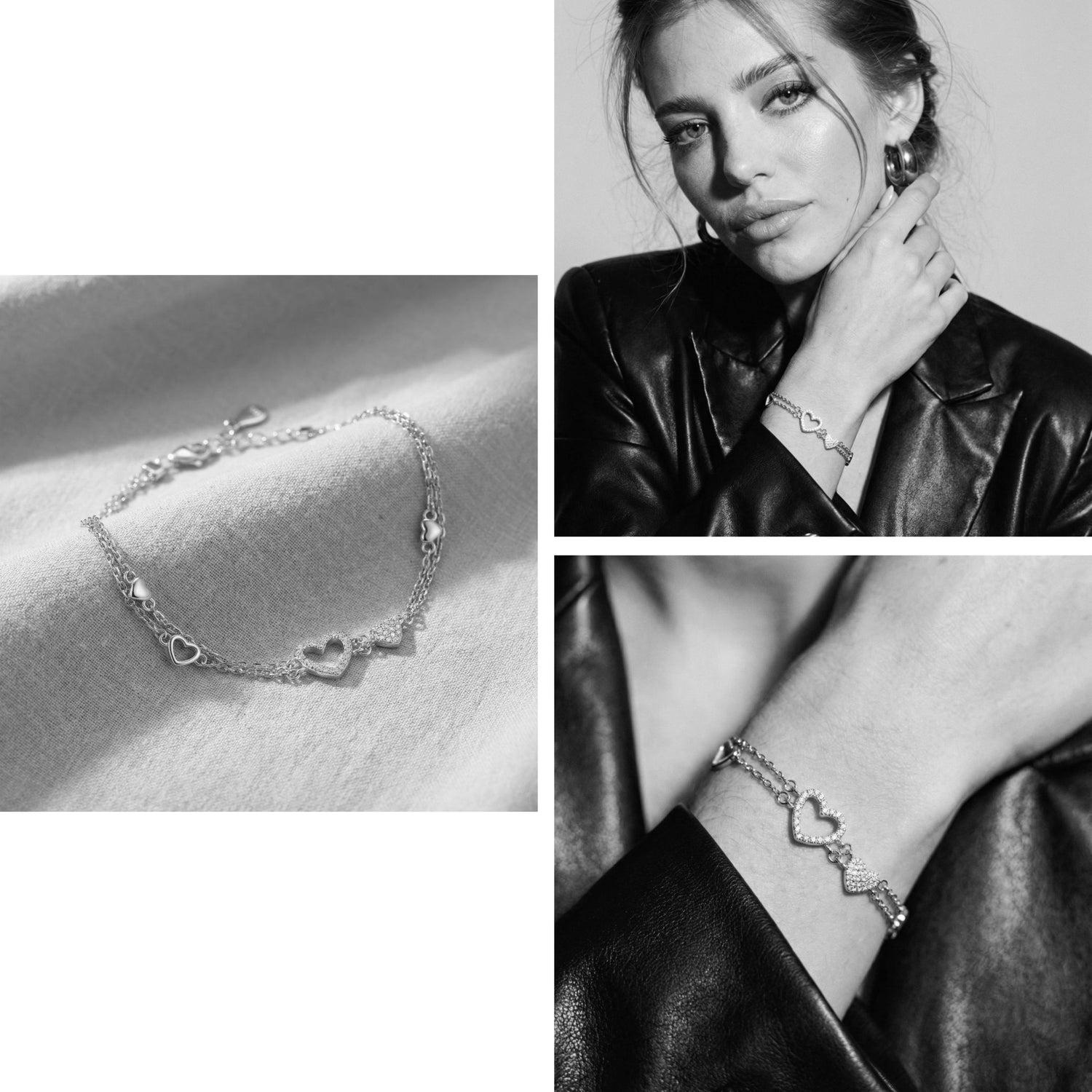 Dieses feine Armband kombiniert eine doppelte Kette mit mehreren herzförmigen Elementen, die dezent mit klaren Zirkonia-Steinen besetzt sind. Das schlichte, feminine Design macht es ideal für den Alltag und besondere Anlässe.
