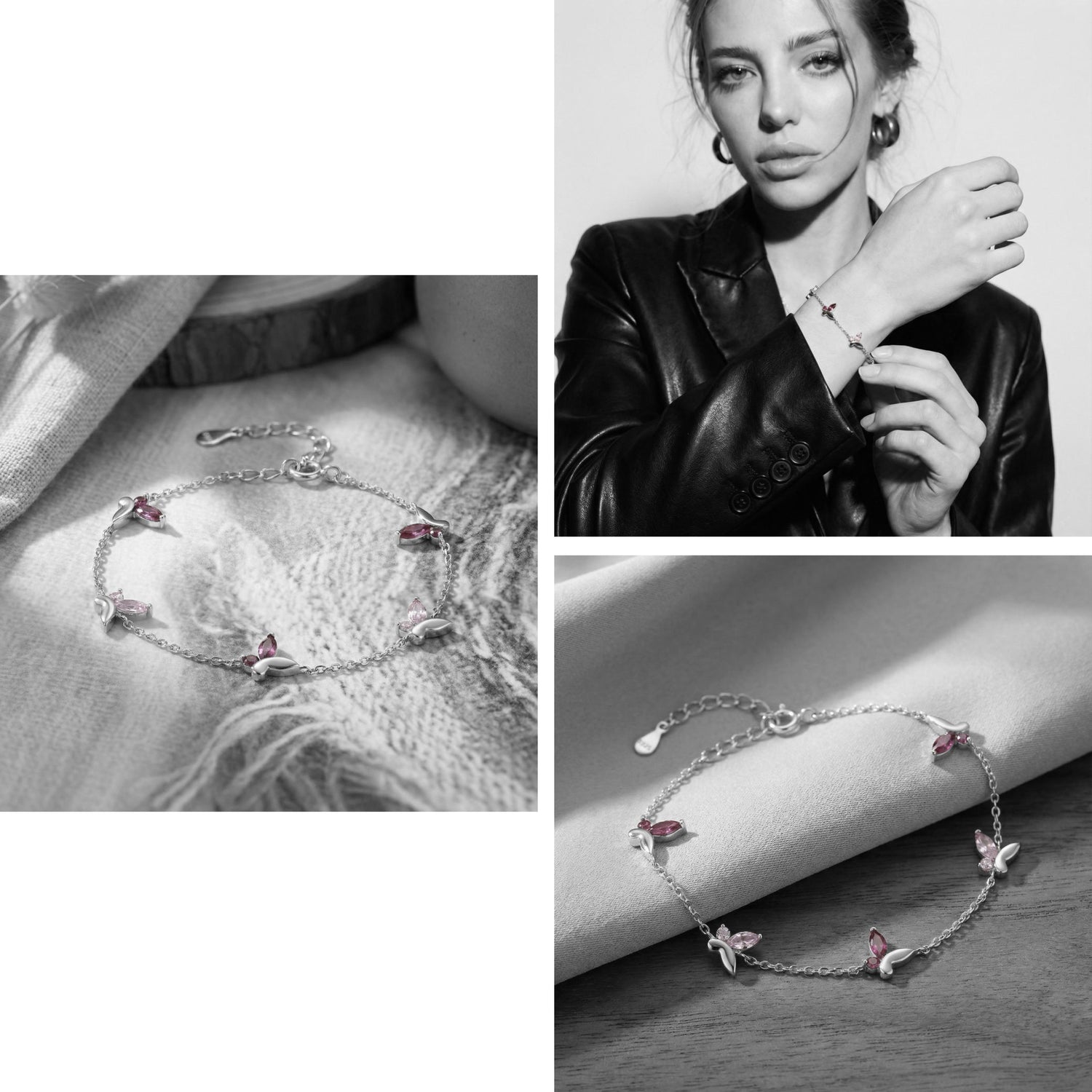 Die fein gearbeiteten Flügel- und Blütenelemente in Rosatönen verleihen dem Armband eine leichte, romantische Ausstrahlung. Die glänzende Silberkette sorgt für einen harmonischen Kontrast und lässt die farbigen Steine besonders strahlen.
