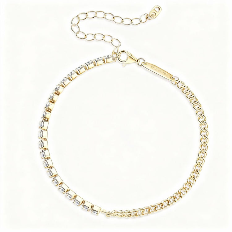 Das Zweifach Glanz Armband vereint zwei edle Stilwelten in einem Design: eine feine Gliederkette und eine funkelnde Steinreihe, perfekt aufeinander abgestimmt. Dieses Armband wurde für Frauen geschaffen, die schlichte Eleganz lieben und gleichzeitig einen Hauch von Luxus tragen möchten.